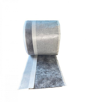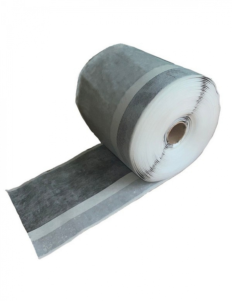 Гидроизоляционная бутилкаучуковая лента, дублированная нетканым полотном, имеющая с каждой стороны самоклеящийся слой, защищенный антиадгезионным материалом.